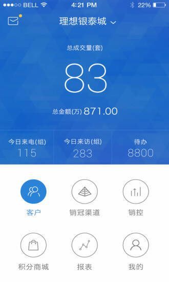 成交、访问、来电等各项指标一目了然;能即时查询销售额度,了解楼盘剩余房源;可对多个小区进行对比查看,为客户推荐最佳房源;能精准掌握每一户的销售情况,随时更新查看是否签约。