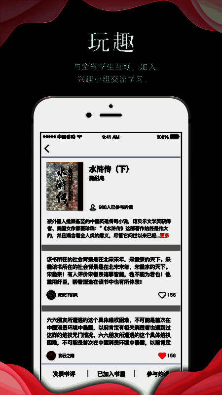 4、支持添加书籍到书屋、发表书评、点赞书评、参与约读、提问问题、参与讨论等功能。