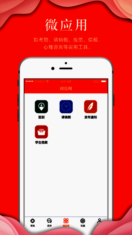 4、微应用:涵盖考勤、请销假、投票、信箱、心理咨询等实用工具。