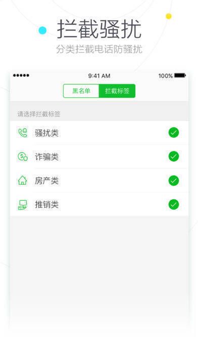 拦截骚扰电话:支持黑名单管理,分类拦截骚扰电话。