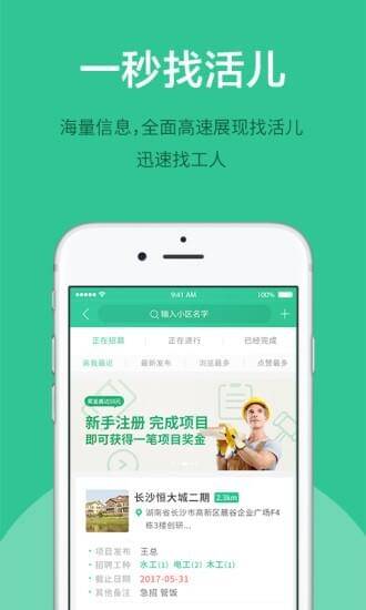 3、一秒找活儿:海量信息,全面高速展开现找活儿,迅速找工人;