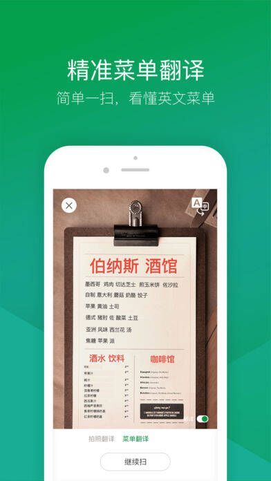 2、增加AR菜单翻译功能:结合强大的AR实景技术,简单一扫看不懂的英文菜单就能变成中文。借助云端10万 + 菜单菜谱数据,让菜单翻译结果更准确、更可靠。