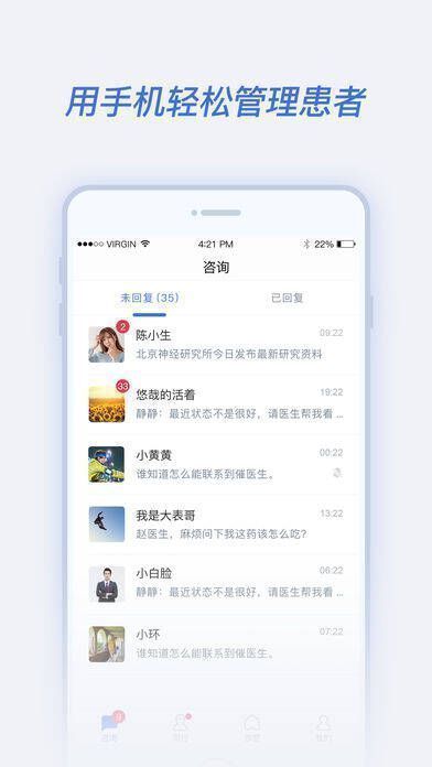 通讯录管理:添加其他医生为好友,与同行交流,积累经验,解决疑难病患问题。