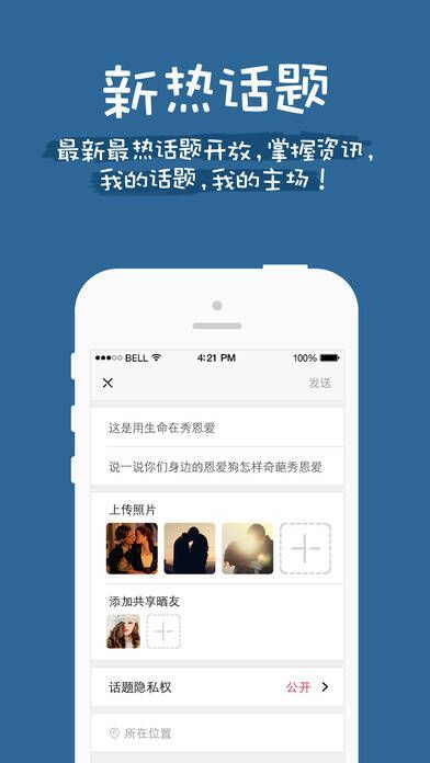 2、一键创建话题,你就是地盘的主人。可以发掘话题,与好友共享度蜜月、宝宝成长、家庭日等甜蜜难忘时刻的美图,随意添加好友并设置多种权限。