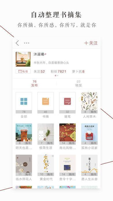 在白纸黑字间,我们仿佛能听见虫鸣犬吠,看到离人落泪、红叶漫天、长歌痛饮的场景。无数精彩画面、绮丽故事,令人陶醉。笛卡尔说“我思,故我在”,面对文字,我们凭借想象和思考构建自己的世界,体验纯粹的存在感。这个世界只属于自己,他人难以触及。当被同一段文字触动,共鸣在哪,拨弦人又在哪?于是便有了萝卜书摘。萝卜味淡醇香、朴素营养,恰似捧读的文字与阅读心境。每段文字都是连接的起点,用文字之美和思考碰撞的火花,深度连接那些看似无交集的人。