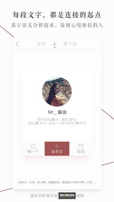 告别手抄党,随时记录。萝卜书摘能直接识别图片上的文字,对想摘抄的内容随手拍照识别就能转换成可编辑文本,还能表达当下思考内容(电子书可直接截图选取图片识别)。挑书困难、浪费时间?“自选”添加想读或感兴趣的书,获取正在阅读本书小伙伴的书摘及想法分享,提前了解书籍信息,找到值得读的书。告别孤独,建立和加入感兴趣的阅读圈子(APP内的萝卜坑),和有共同话题的小伙伴一起阅读,还能发起共读分享交流。这款App还能在一定程度上理解文字意思和情绪,匹配同一本书的文字、类似风格文字、常发类似风格文字的人及群组。