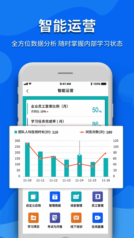 点击“智能运营”按钮,可查看企业内部员工的学习情况。