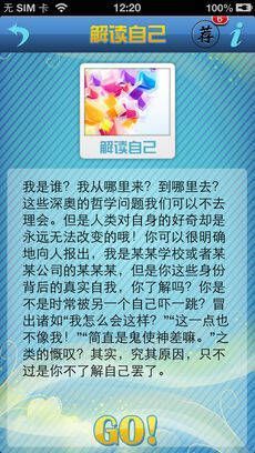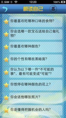 1、游戏中无论你想知道或不想知道的内容,最终都会知晓;2、做完测试后,其准确性定会让你惊叹;3、本游戏有三大类、200多道测试题,全面帮你认识自己!