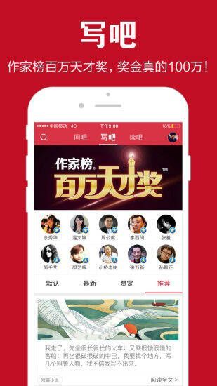 该软件包含“写吧”“问吧”“聊吧”三大功能。“写吧”能让您随心创作;“问吧”可和郑渊洁、唐家三少等当红作家真人在线互动;“聊吧”能自由发表读书心得、交流想法。