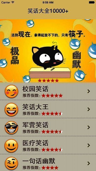《笑话大全10000+++》专注于收集各类精彩段子,比如“活到现在,拿得起放不下的,只有筷子”。它已收录10000+精彩笑话,包含极品幽默、雷人语录、校园笑话等多种类型,且持续收录新笑话。