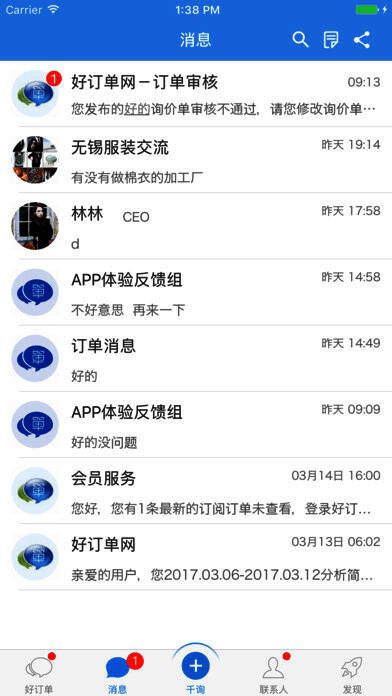 好订单千询是好订单网推出的移动社交APP。它依托好订单平台资源,为广大纺织服装行业从业者提供高效、便捷的移动沟通和客户管理工具,能大幅提高对接效率,促进需求向订单转化,还能为双方积累更多合适的业务伙伴。