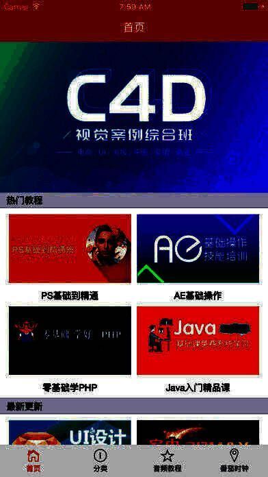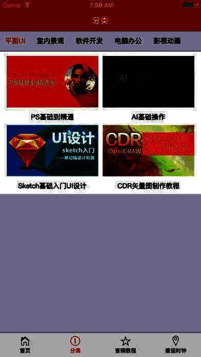 【分类】包含平面 UI、室内景观、程序开发、影视动漫、电脑办公等 5 大类别,每个类别下有相应视频课程,用户可自主选择学习。