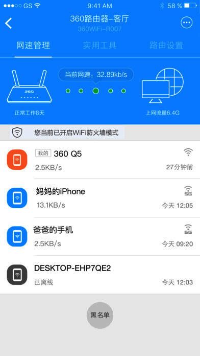 1、设备列表:可随时随地管理联网设备,设备状态一目了然。你能针对性地设置任一设备的网络访问权限、数据访问权限、智能分配带宽,还能为设备起绰号。