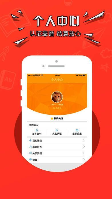 4、【我的】 在个人中心可轻松编辑简历,“我的钱包”能便捷快速提现,还能随心收藏关注喜欢的兼职,与好友分享好的兼职任务。