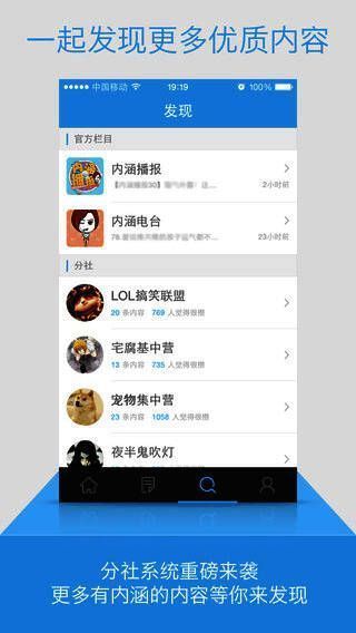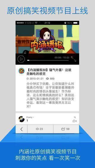 内涵社是个超没“节操”的搞笑图分享社区,这里每天都会产出成千上万的段子,有各种最新的内涵图片、小视频等,每天超500万用户浏览。在这里,大家能发现生活中形形色色的搞笑内涵瞬间,并和他人一起分享。