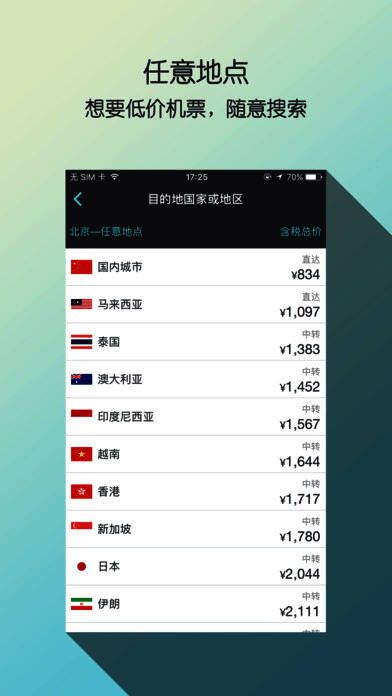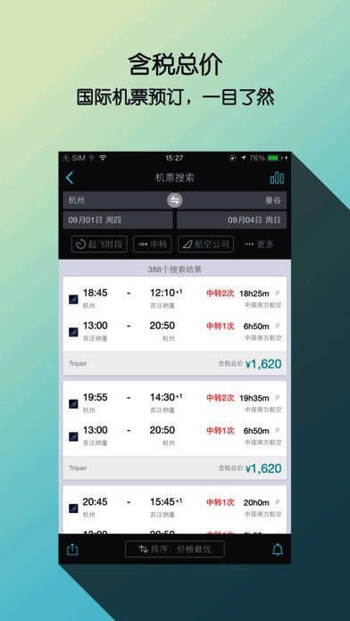 - 机票:汇聚全球各大航空公司及廉价航空公司上百万条国内和国际航班信息,可海淘各类特价、打折、低价国际机票,且呈现含税总价,清晰明了。