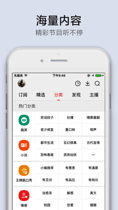 段子手脱口秀,为坐车、排队等无聊时刻增添欢乐;听书社区,拥有海量玄幻与网络有声小说;英语电台,助你练就出色英语;财经新闻电台,解放双眼,聚焦头条;儿童电台,田亮刘烨陪宝宝听儿歌、听故事。