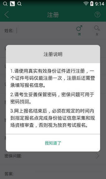 2、请考生务必牢记注册时设置的“密保问题”与“密保答案”,这两项信息是登录密码丢失后自行找回密码的重要验证项。