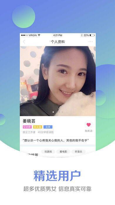 使用这款软件,你能快速结识同城单身男生,以真实姓名在线交友,杜绝虚假,让生活不再单调。它还能帮你快速找到兴趣相投、三观一致的用户,一键完成匹配。认识身边更多人,还能线下约会见面,让生活丰富多彩。