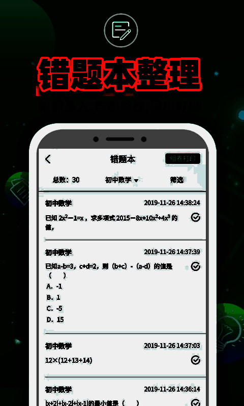只需一键拍照录入,就能快速将错题加入错题本,同时反馈正确答案与详细解题思路,智能标注错题知识点,提供同类题练习,做到学一题会一题,学三题会一类题,避免错题再错。