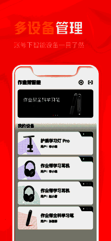 家长能便捷地通过作业帮智能 App 绑定、管理作业帮全科学习笔等智能硬件设备。
