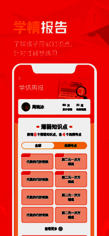 孩子的学习记录,像答疑、交作业情况会即时同步到 App,每周生成学情报告。
