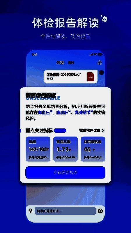 讯飞晓医APP具备强大的报告解读能力。用户上传医学体检报告后,软件能迅速解读各项指标与结果,并给出详细解释和建议,使用户及时了解自身健康状况,以便做出调整或获取就医建议。