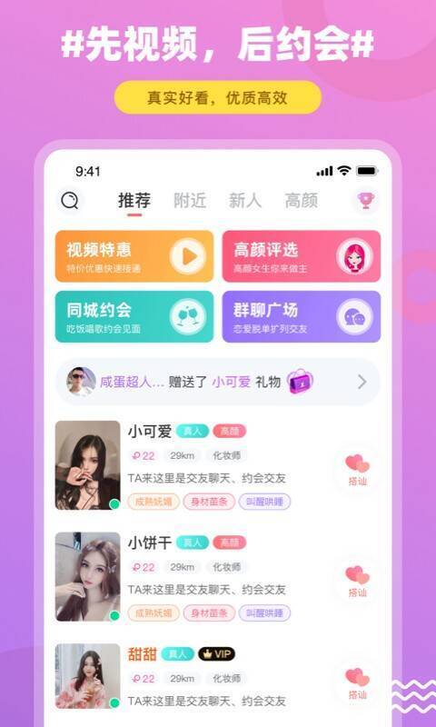 2. 视频聊天:用户能通过饭友与附近妹子视频聊天,增添情感亲密度与陪伴感。