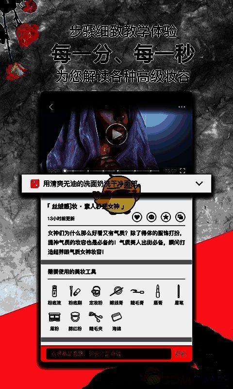 【分频教学】具备视频分频教学功能。其独有的“镜子”功能极具颠覆性,你可以边照着镜子边同步跟着视频轻松学化妆;