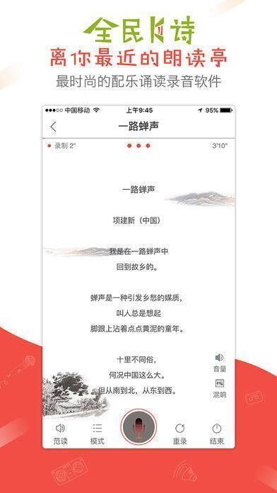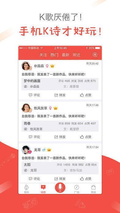 想体验诗歌朗读的独特乐趣吗?快来下载《全民K诗》!它为你打造了一个专业的诗歌朗诵与阅读平台。在这里,你既能阅览海量诗歌,又能和其他诗歌爱好者切磋比拼。你可以挑选心仪的音乐伴奏读诗,还能与小伙伴PK。全民K诗app让你尽情感受古诗词魅力,能为经典诗歌配音。它还有诸多特色,如静心舒压等。v1.0.8版本修复了点击头像崩溃问题。