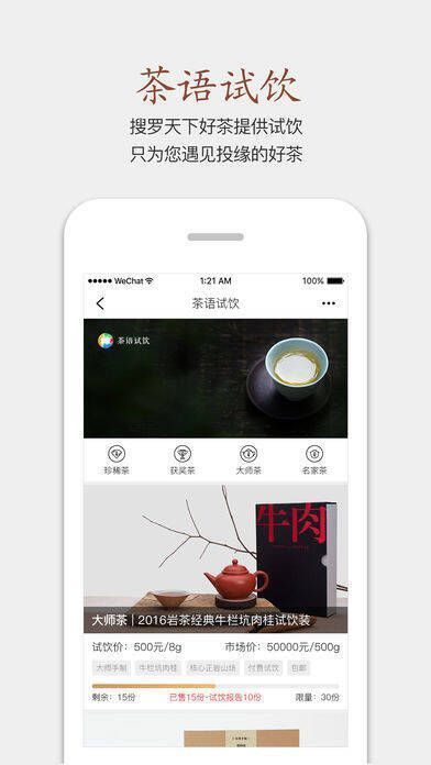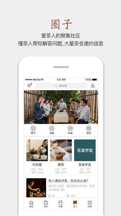 软件以茶为媒介,构建东方生活美学主流APP,涵盖茶类、茶器、香道等知识体系。每日超30万茶友在此学习、分享。上百名非遗传承人、茶界大咖及上万名资深茶人分享茶文与好茶。