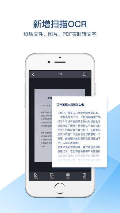 新增免费的扫描OCR功能,可将纸质文件、图片、PDF实时转文字。在写论文、作报告、读书、合同电子化等场景中都非常实用,让所有资料都能云端留存。