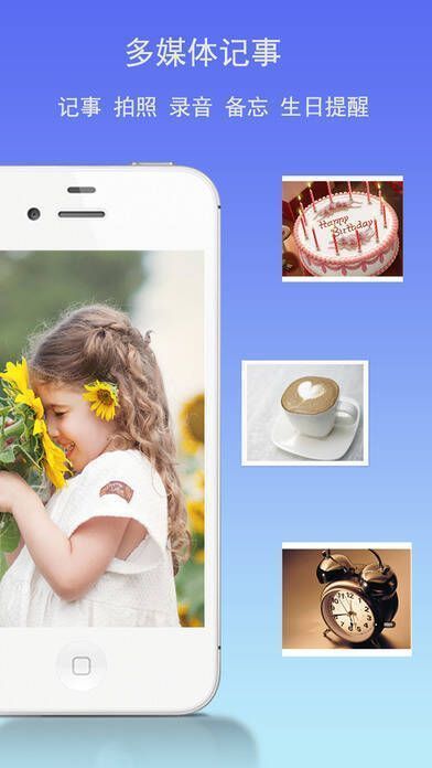 3、【高效记事】支持文字、录音、图片全方位记事,支持记事分类,如工作、生活、购物等一目了然。支持云备份,防止记事丢失。支持重要备忘标星号,自动标在月历上,清晰醒目。