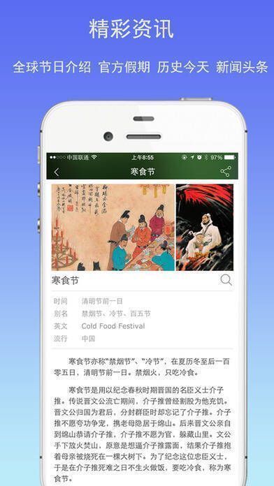 2、【全球节假日】涵盖中国、香港、台湾、新加坡、韩国、英国、美国等十几个国家和地区的节日及官方假期,有数百个节日,每个节日都有精美解说,是了解世界民俗的窗口。