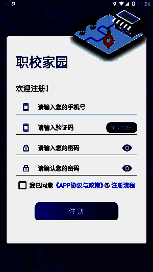 这是专为高职院校学生打造的实习好帮手,方便查询相关内容,普及实习知识,也便于上传实习资料。首次注册需输入手机号码和接收到的验证码,设置一个密码并输入两次,之后可用手机号或身份证号登录。