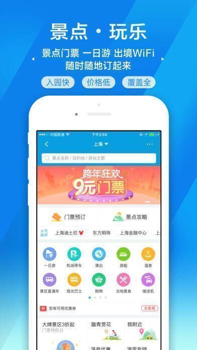 4、旅游:提供国内各大城市旅游景点的当地游、租车服务,以及热门演出票和景点门票的查询、预订。
