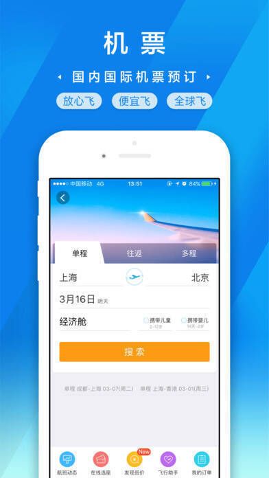 2、机票:有低价助手,支持航司直销,手机订票方便优惠,多种价格和组合供你选择,还能预约选座、实现掌上值机。