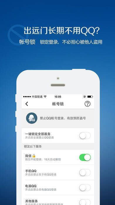 开关操作自如,能全面掌控QQ登录。每次锁定最长15天,到期后自动解锁。