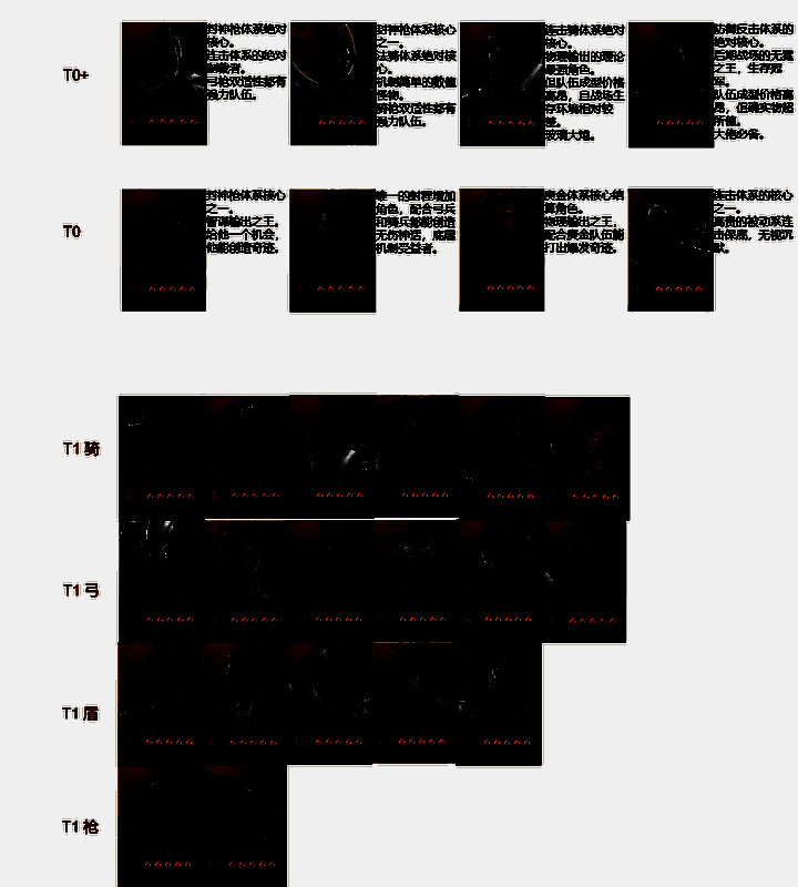 T1:降龙伏虎 见龙在田 纵地金光 连战连捷 撞阵冲军 椎锋陷陈 以战养战(按照现在的地位来说T0没问题但是他是紫色卡)
