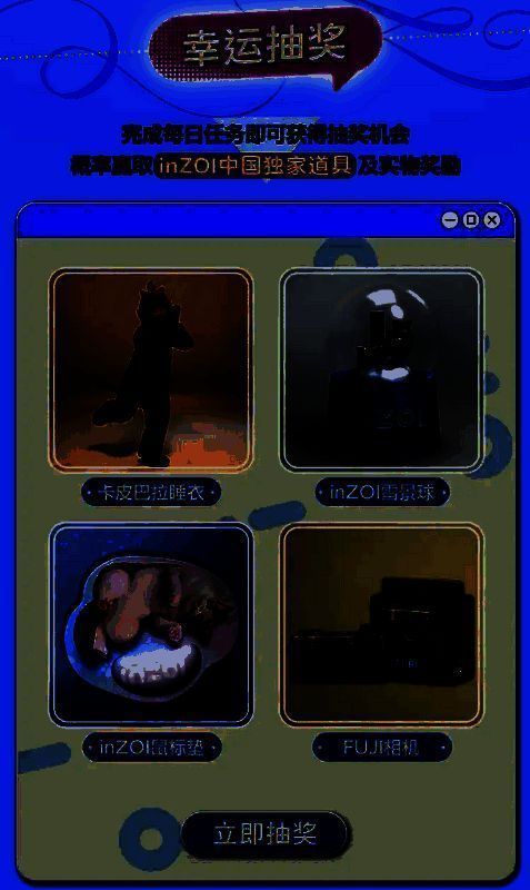 不仅如此,完成每日任务即可获得抽奖机会,概率赢取《inZOI》中国独家道具以及实物奖励,其中奖励有卡皮巴拉睡衣、inZOI雪景球、FUJI相机、inZOI鼠标垫。