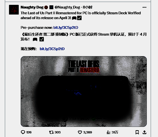 近日,顽皮狗已正式宣布,《最后生还者2重制版》已通过Steam Deck认证,本作将于2025年4月4日发售。登陆Steam和Epic平台,Steam国区游戏售价345元,支持中文,感兴趣的玩家可以点击此处进入商店页面。
