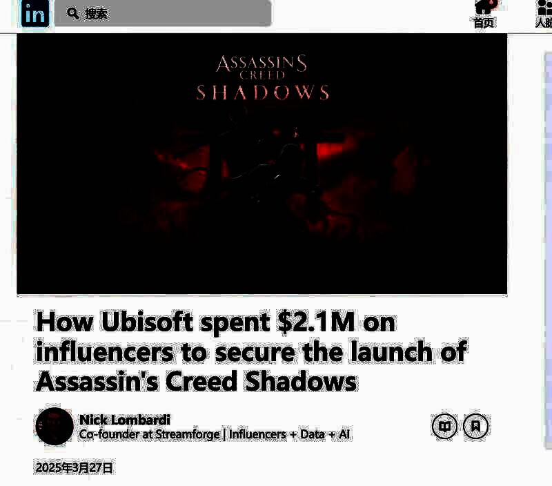 根据领英上SteamForge创始人Nick Lombardi发布的一篇报道,育碧给主播们分发了大约1000份《刺客信条:影》游戏(不含评测作者),其中Twitch主播689个,油管主播178个,TikTok主播105个,合计972人。
