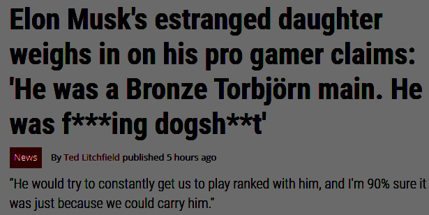 ·重点是,马斯克喜欢使用托比昂这个英雄,但是水平烂到出奇,只能排在游戏最底层的青铜段位,在评说马斯克的游戏水平时,使用了fucking dogshit的极端词语形容,虽然不排除目前两人关系不佳的影响,但是已经足够说明问题了。
