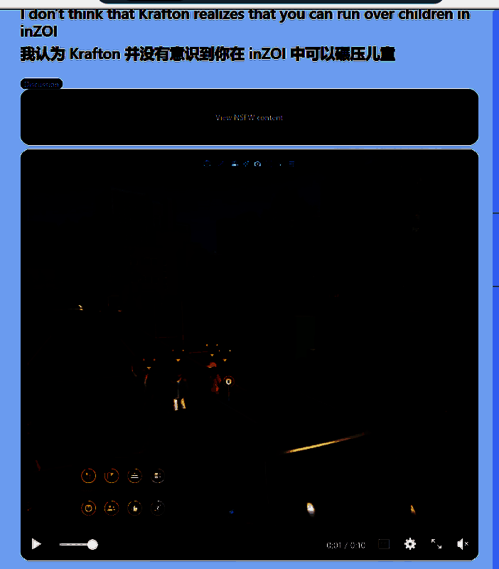 该bug的发现是有人在《inZOI》的Reddit帖子上发了一个名为“我不认为Krafton有意识到你在《inZOI》里可以用车碾死孩子”的帖子,这个帖子迅速流传开来,并引起玩家们热议。