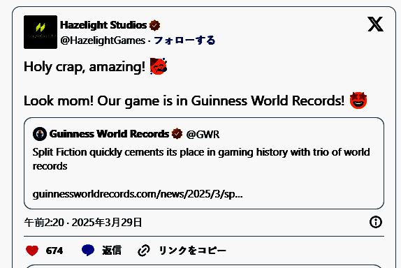 《双人同行》开发商Hazelight Studios继本作好评口碑之后,近期刚刚发售的新游《双影奇境》再次收获压倒性好评如潮,销量口碑双丰收,日前官方宣布突破三项游戏吉尼斯记录。