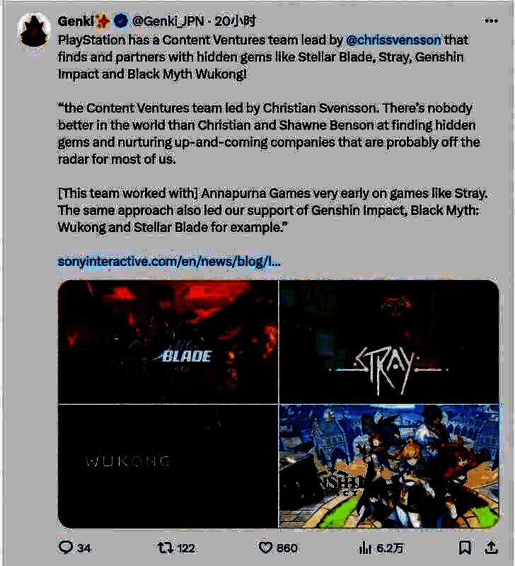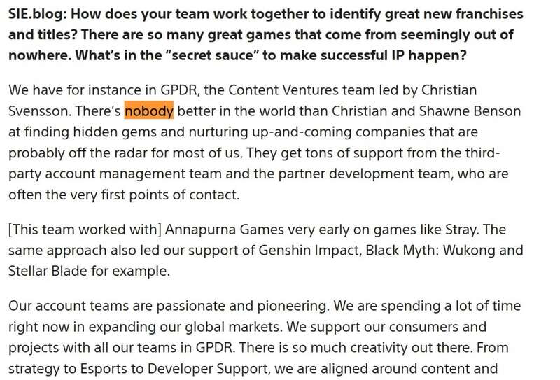 “由Christian Svensson领导的Content Ventures团队。世界上没有人比Christian 和 Shawne Benson更善于发现隐藏的宝石并培育大多数人可能没有注意到的新兴公司。该团队很早就与Annapurna Games合作开发了《迷失(Stray)》等游戏。同样的方法也促使我们支持了《原神》、《黑神话:悟空》和《星刃》等游戏。”