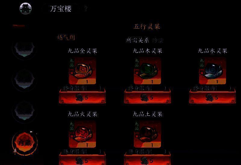 万宝楼中出售的物品很多,这里优先推荐大家购买的就是各种属性的灵果,分别是金木水火土。每一种九品灵果的限定购买次数是10,然后需要花费5枚令牌购买一个,当你将其全部购买之后。就可以大幅度提升自己的五行灵根的属性,从而加快自己的修炼速度。