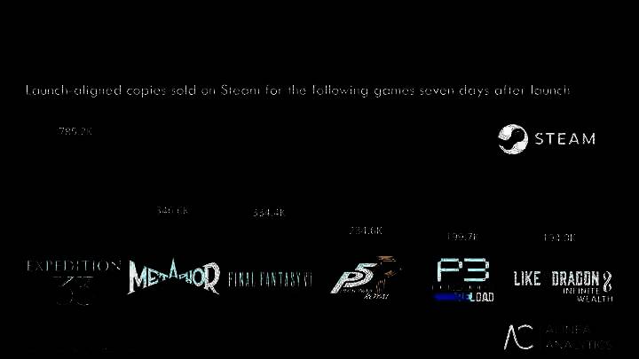 作为一款同时在PC端发布的新系列游戏,《暗喻幻想》在图表中是最直接的对比对象(尽管Atlus的角色扮演游戏在主机端拥有相当数量的受众)。例如,《最终幻想7:重制版》和《女神异闻录5 皇家版》在登陆PC端之前,已经在其他主机平台上发布过了。
