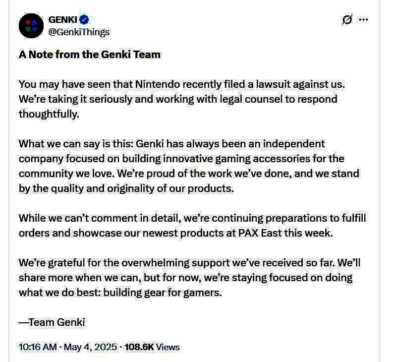 Genki在推特上声明称:"各位可能已经注意到任天堂最近对我们提起了诉讼。我们正在认真对待此事,并与法律顾问合作准备审慎的回应。我们能够说明的是:Genki始终是一家独立公司,专注于为我们热爱的游戏社群打造创新游戏外设。我们为已完成的工作感到自豪,并坚持产品的质量与原创性。"