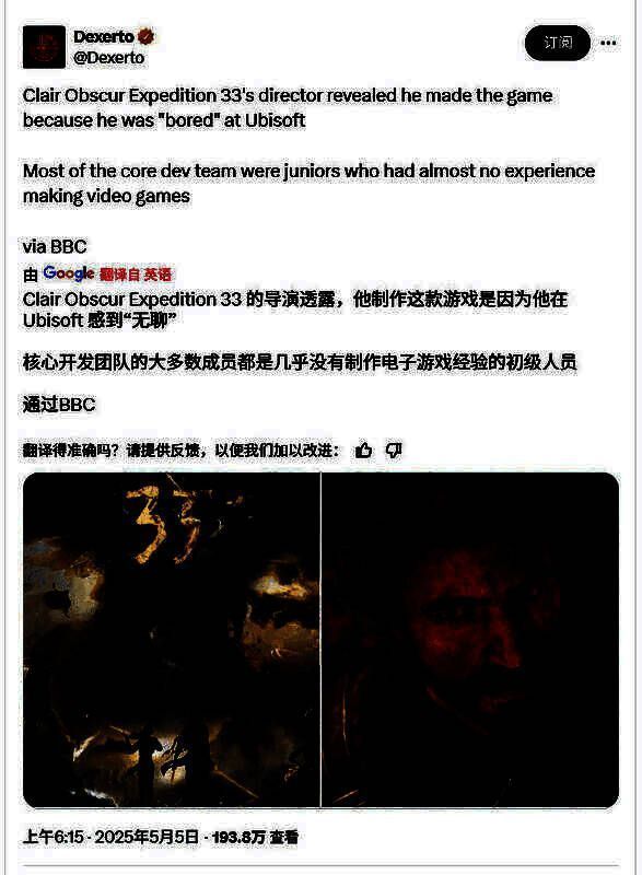在接受BBC专访时,《光与影:33号远征队》总监Guillaume Broche分享了一些有趣的幕后故事。除了他本人,整个开发团队似乎都是“草台班子。”